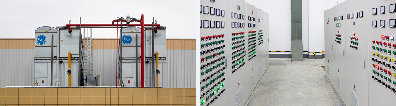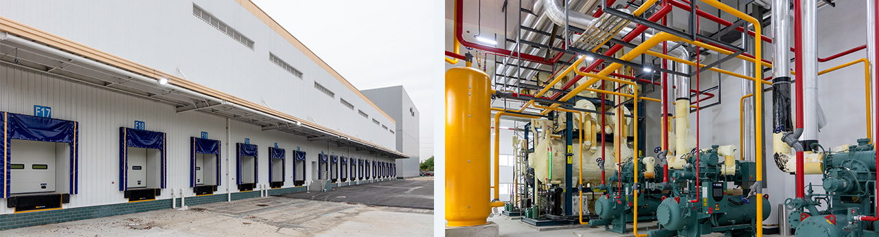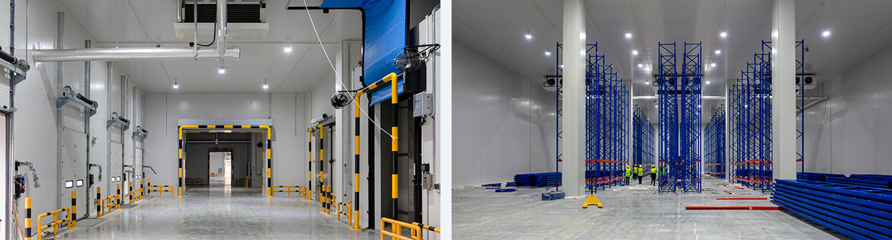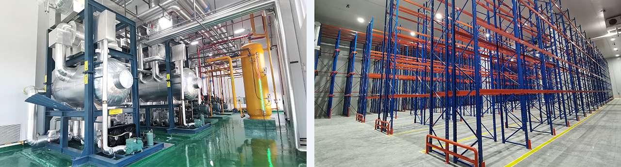 建筑面積108000m2。分為6間高低溫兩用庫(-20°C/-5°C)及南北兩個月臺。低溫存儲1萬噸,高溫5500噸,。山綠集團全自動智能低溫5#車間設計,采用氟(R507A)及二氧化碳(R744)載冷式制冷系統。末端設備采用吊頂式冷風機,水沖霜。